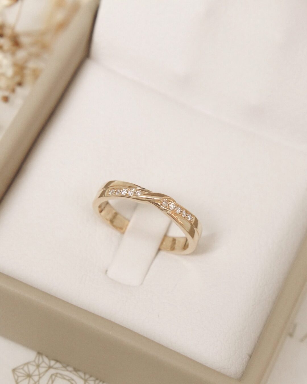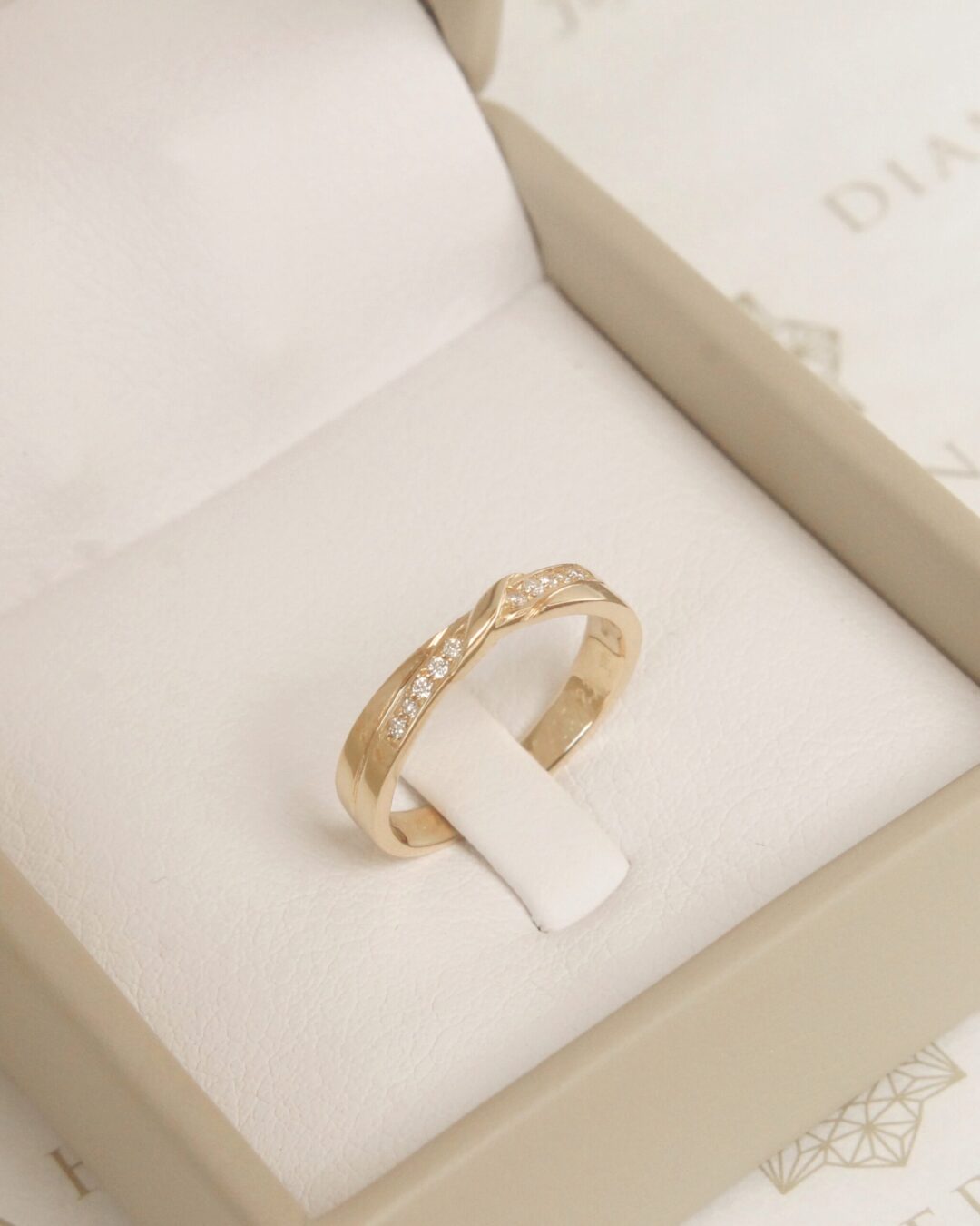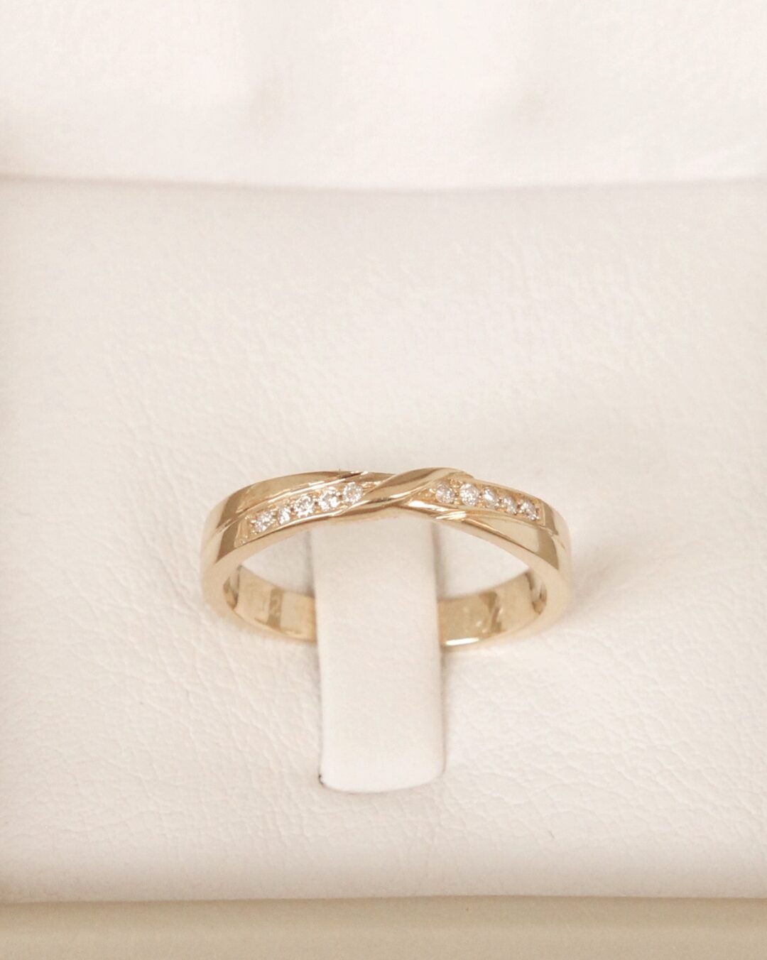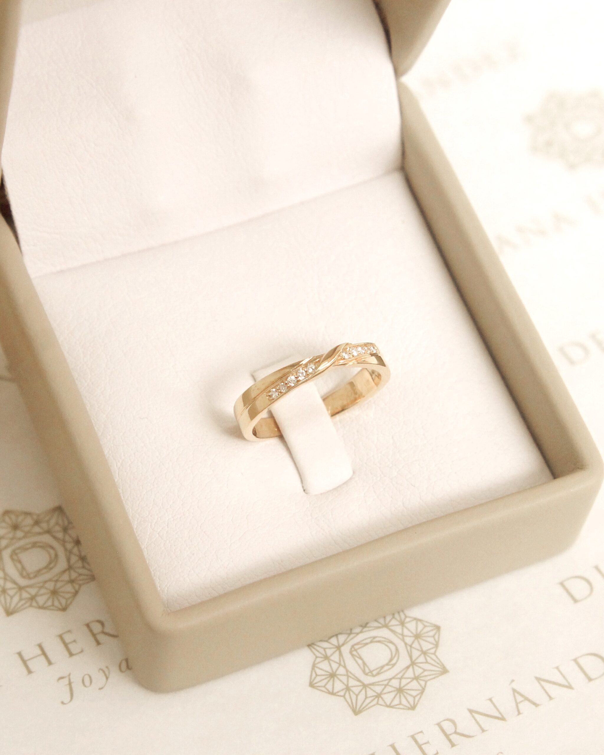 Un anillo entrelazado en oro amarillo, símbolo de amor y de una conexión profunda, adornado con diamantes que destellan y capturan la luz del compromiso compartido.