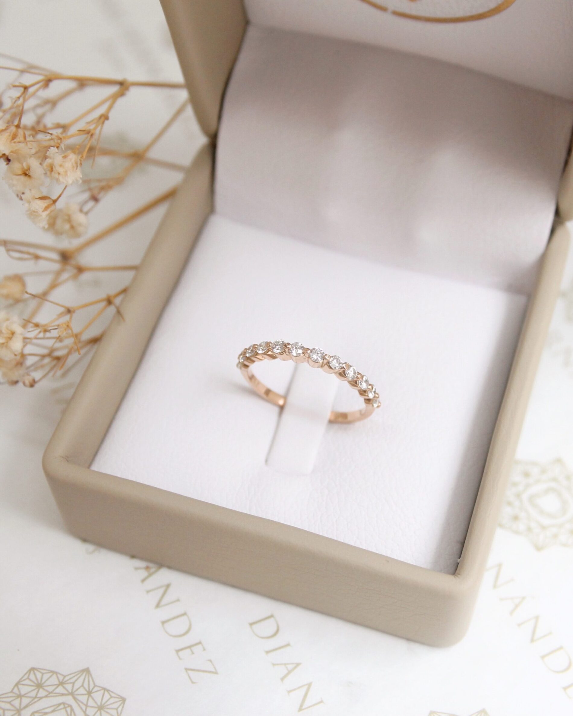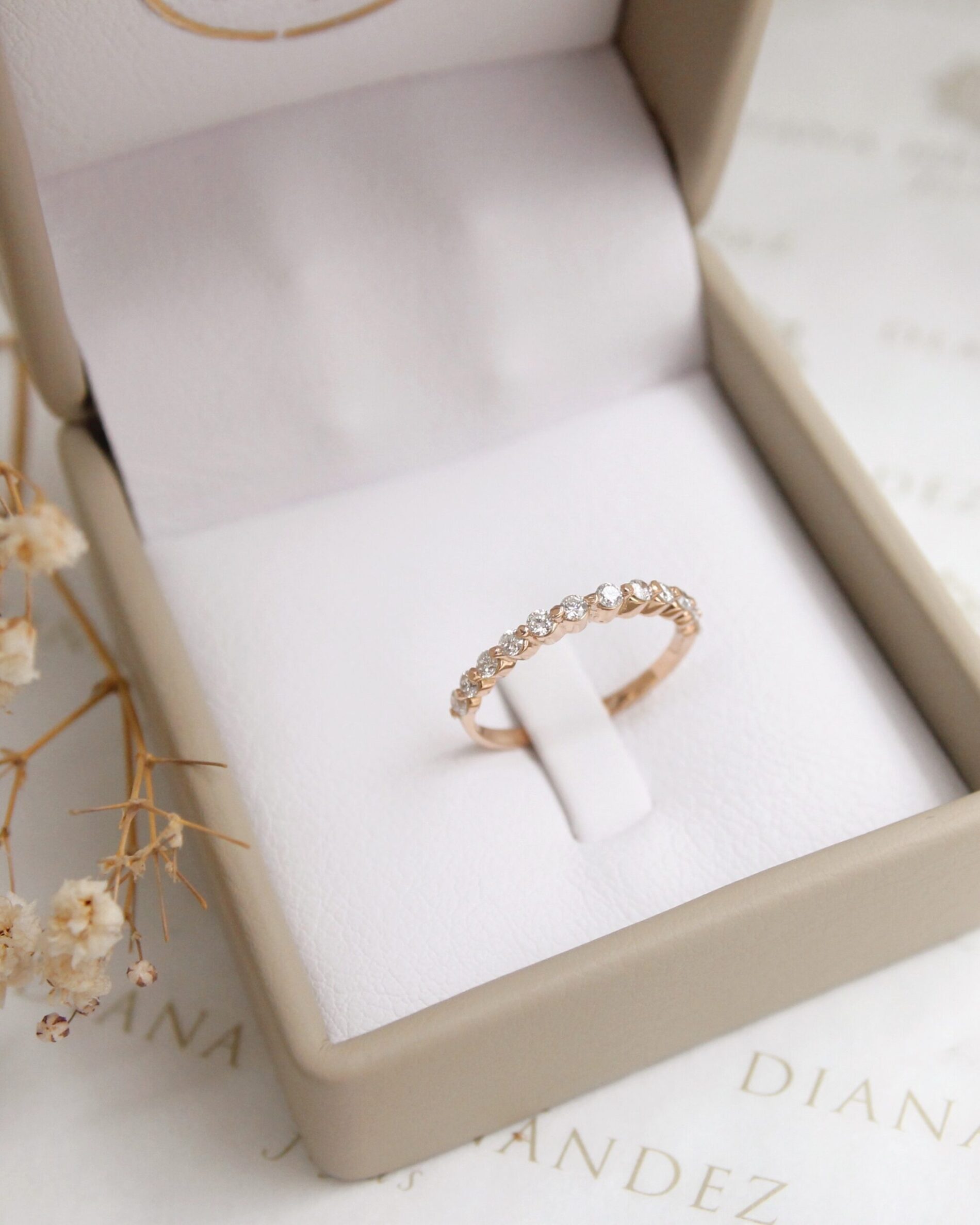 Un anillo de boda de ajuste compartido que se alinea delicadamente para crear un hermoso diseño.