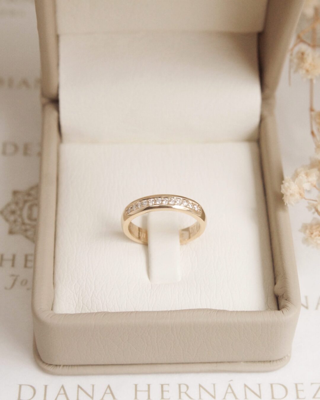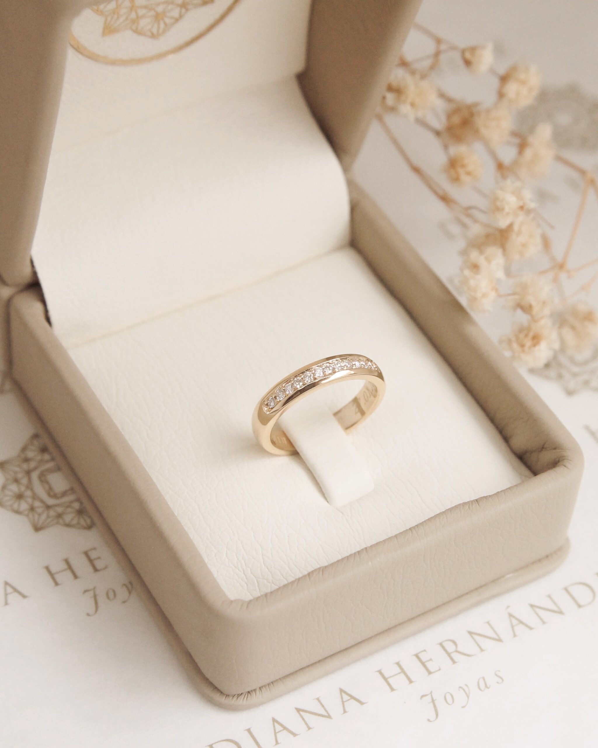 Este encantador cintillo presenta una elegante trenza de dos líneas entrelazadas, simbolizando la unión de dos almas. Una de las líneas brilla con la belleza de los diamantes incrustados en un delicado engaste francés, añadiendo un toque de brillo y distinción a esta joya única.