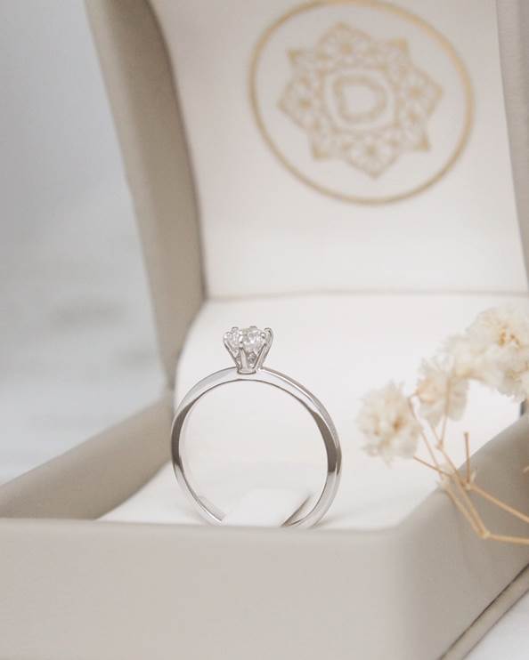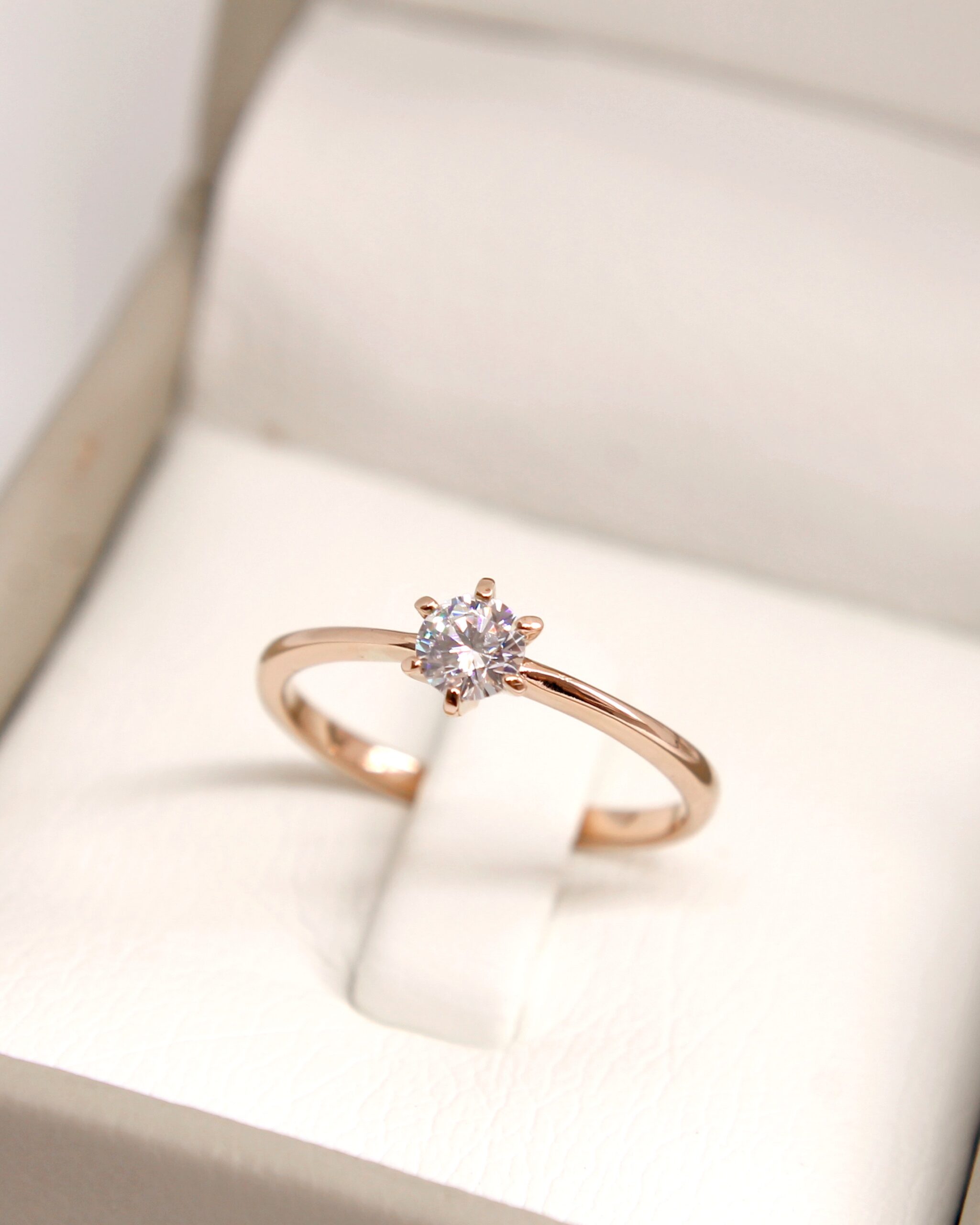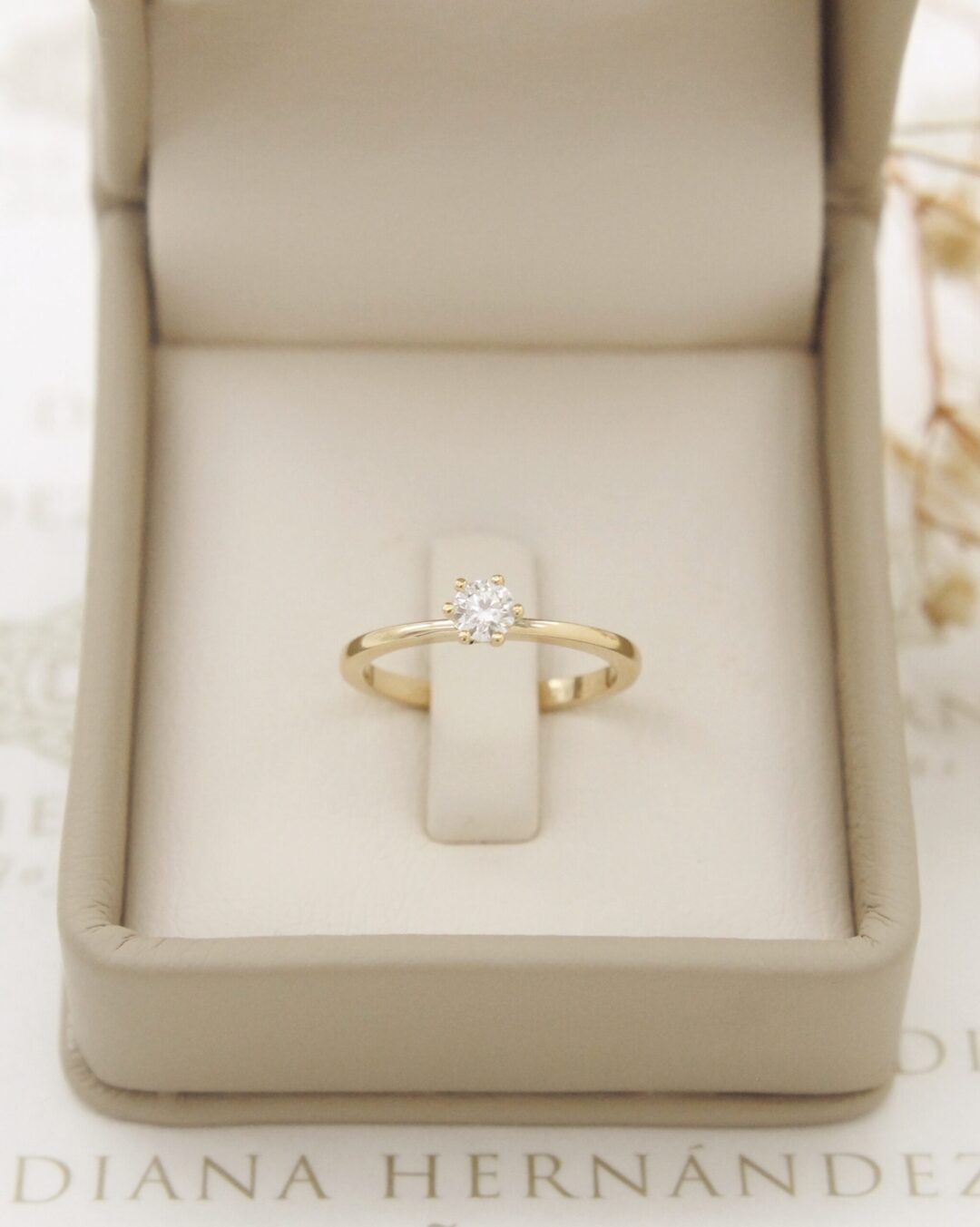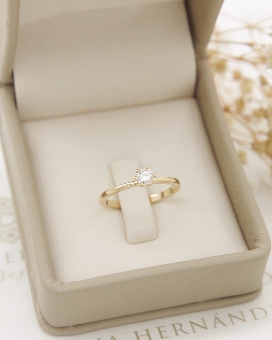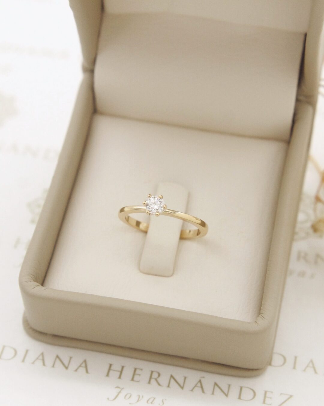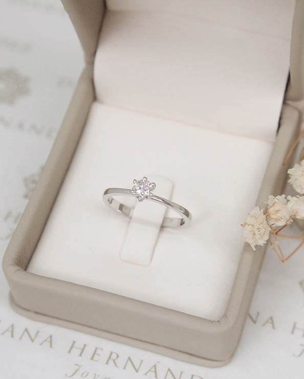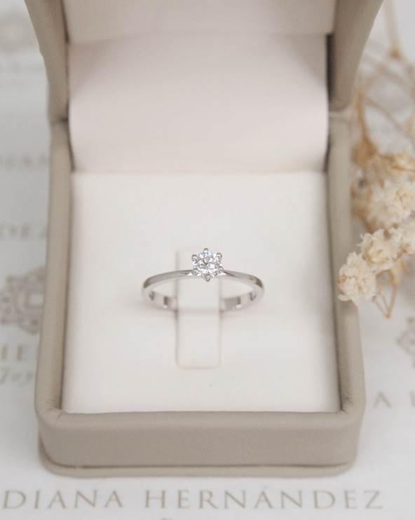 Espectacular anillo de compromiso solitario de 6 ajustes en la piedra central que le da un estilo único y romántico.