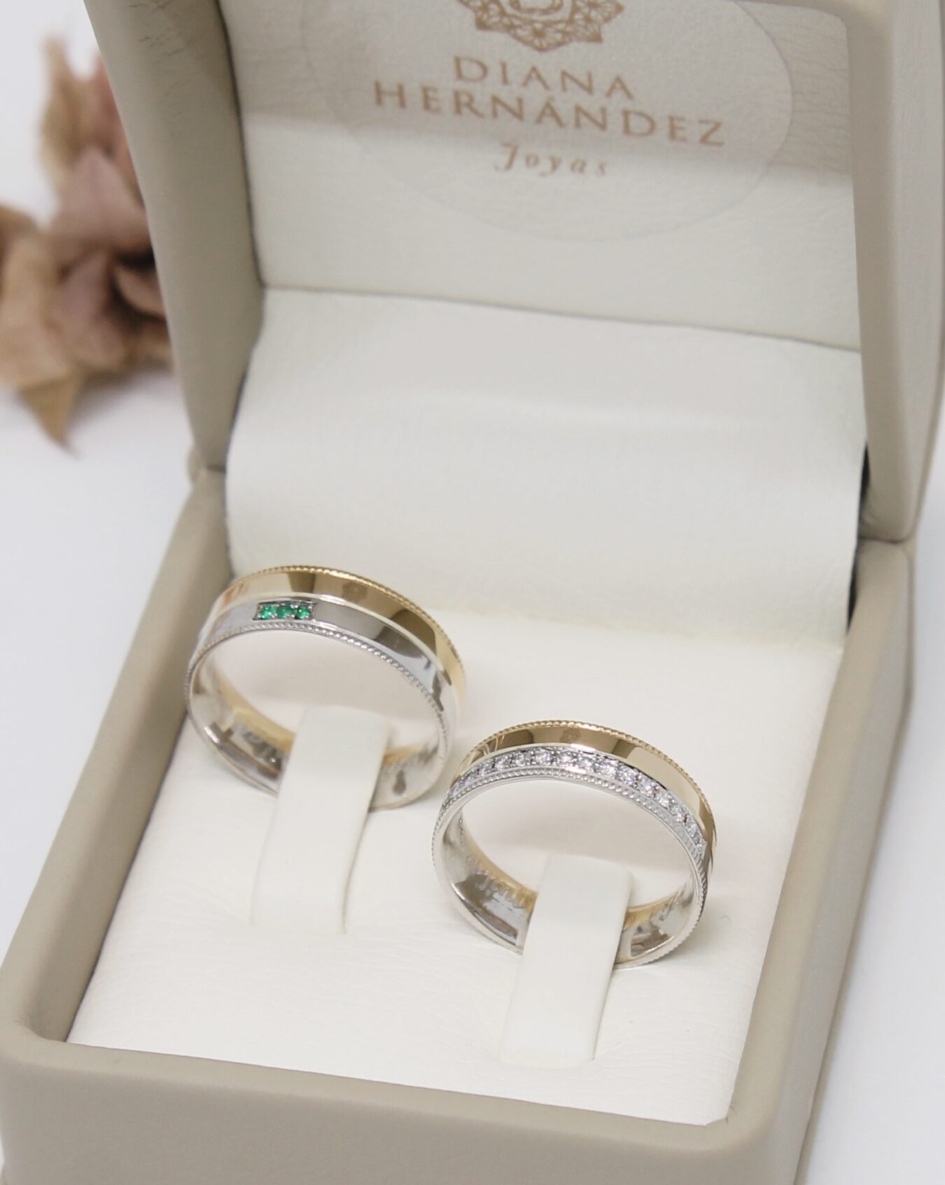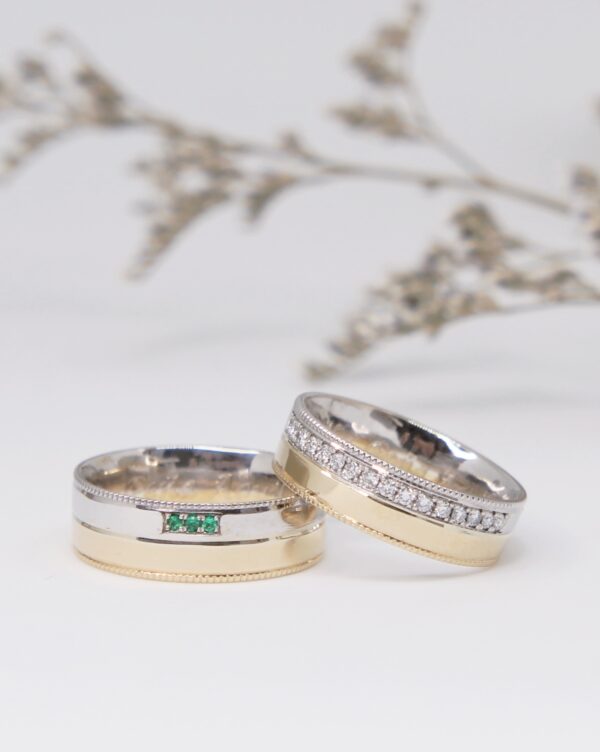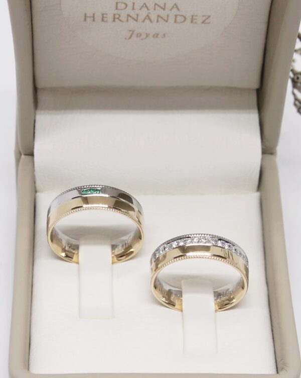 Argollas de matrimonio en dos oros de 18k. Hermosos diamantes y esmeraldas adornan estos tesoros.