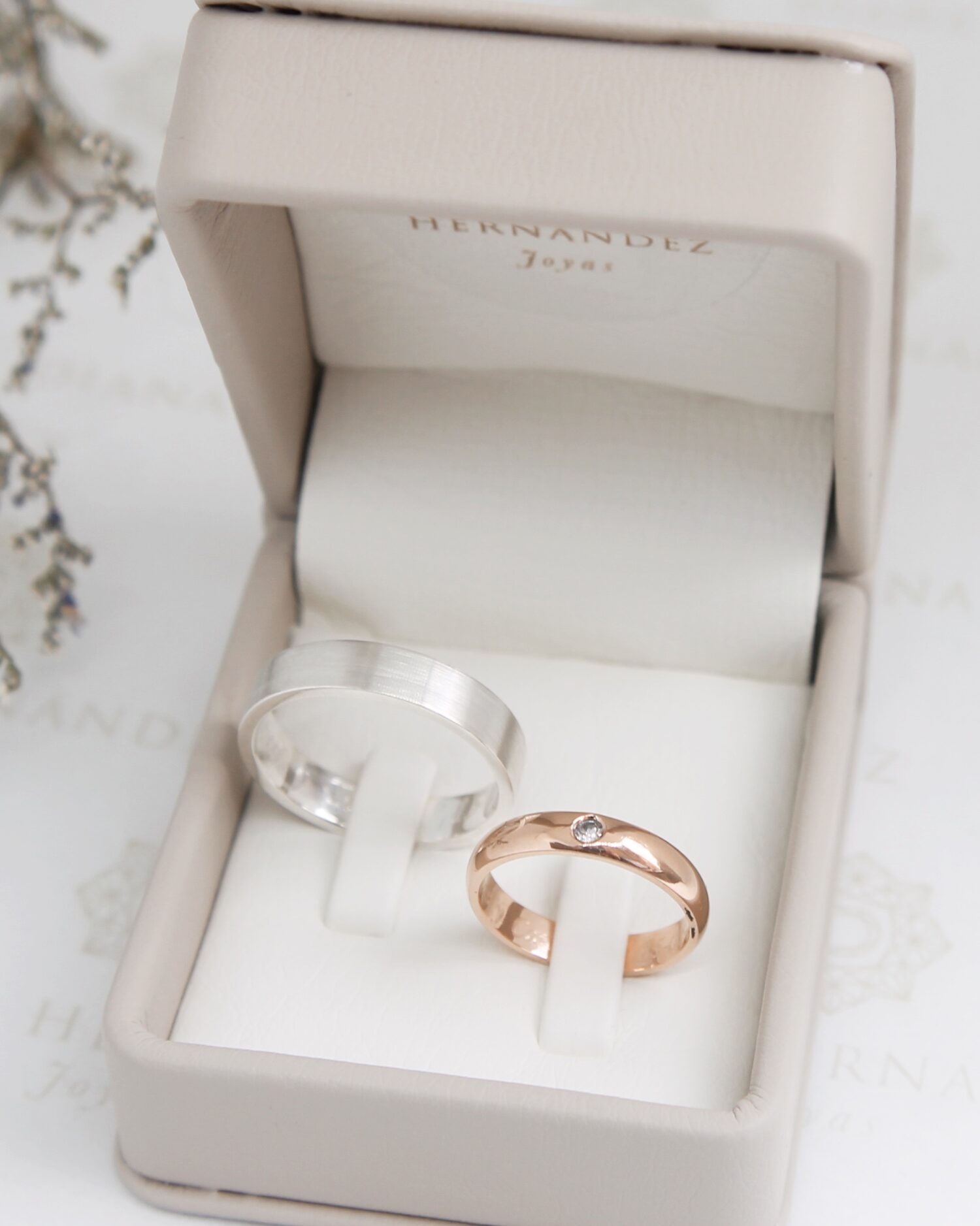 Clásica y románticas argollas de matrimonio. Argolla del novio plana con acabado satinado. Argolla de la novia media caña con diamante