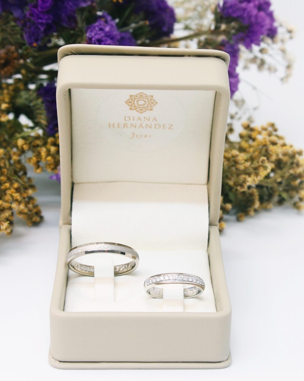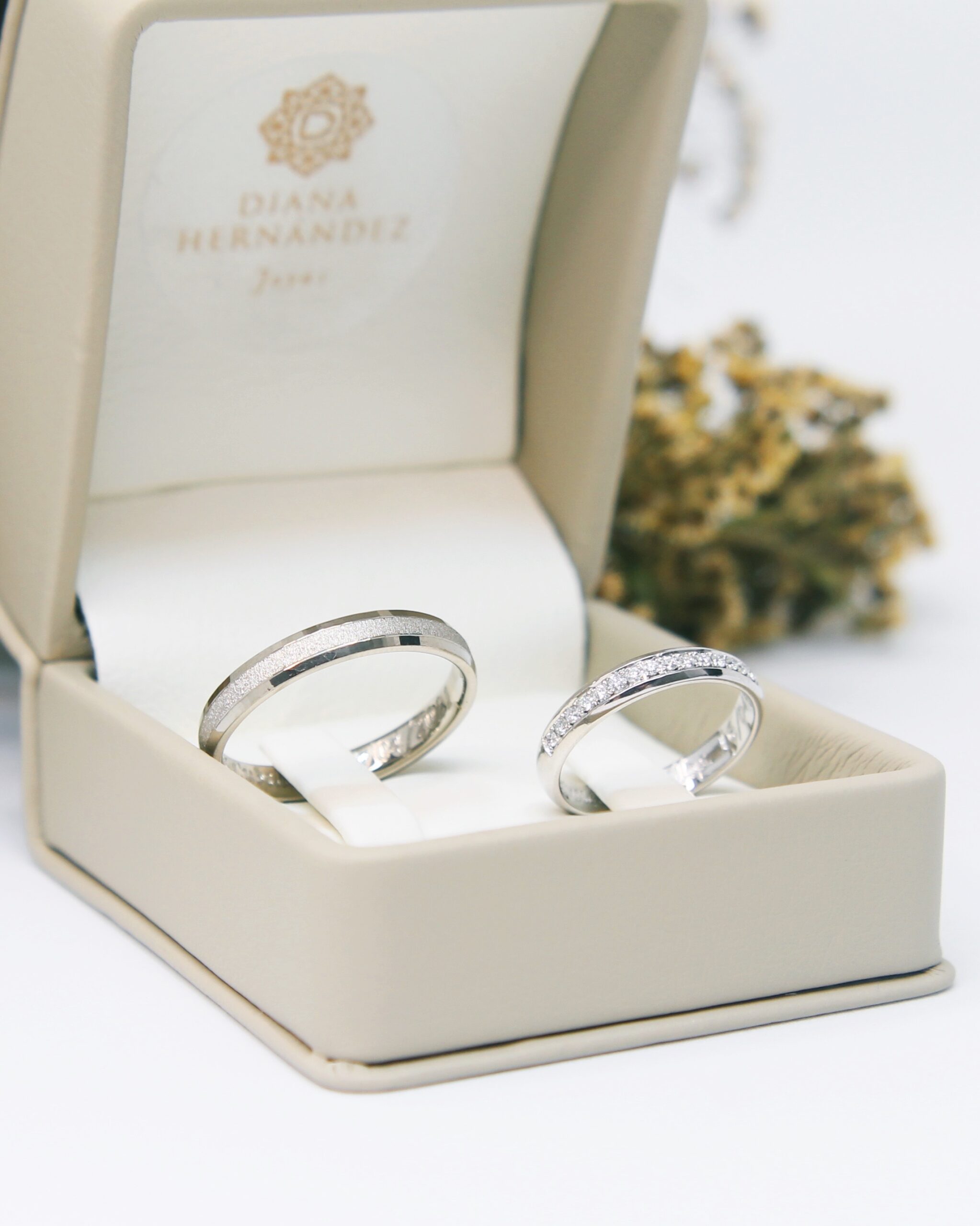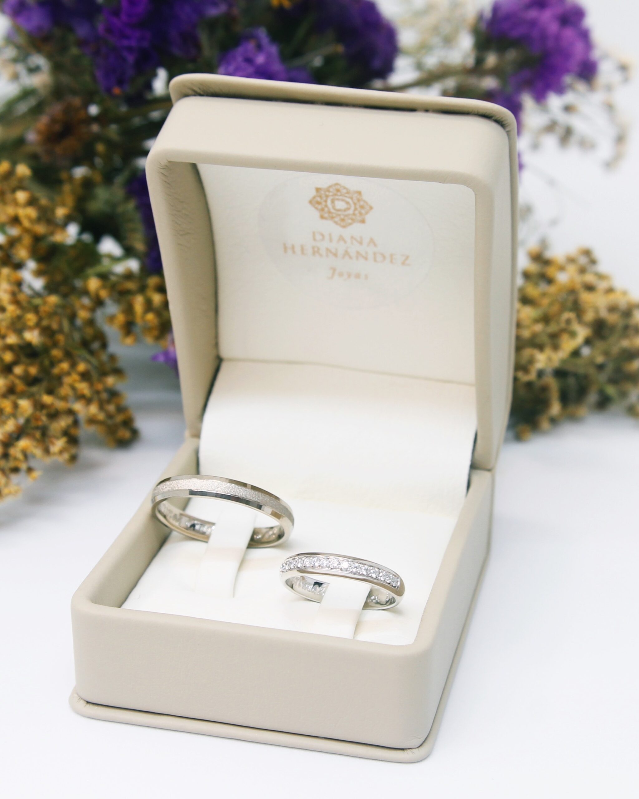 Argollas de matrimonio en oro blanco de 18k y diamantes. Argolla del novio sin rodio. Argolla de la novia cintillo de 14 diamantes.